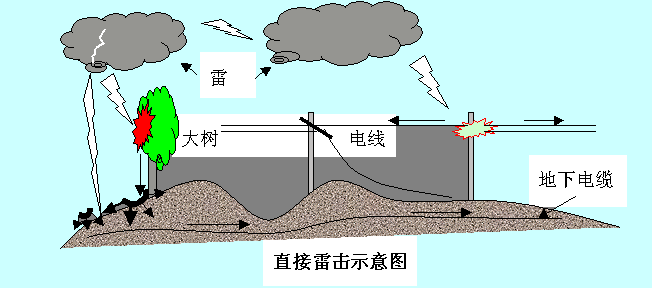 如果雷电直接击中具有避雷装置的建筑物或设施,接地网的地电位会在数微秒之内被抬高数万或数十万伏。高度破坏性的雷电流将从各种装置的接地部分,流向供电系统或各种网络信号系统,或者击穿大地绝缘而流向另一设施的供电系统或各种网络信号系统,从而反击破坏或损害电子设备。同时,在未实行等电位连接的导线回路中,可能诱发高电位而产生火花放电的危险。